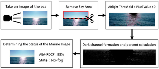 In this paper, we introduce a novel algorithm called Approximating and Eliminating the Airlight—Reduced Dark Channel Prior (AEA-RDCP) designed to address the issue of mistaking sunlight-reflecting sea areas for fog in image-based fog intensity measurement systems. The AEA-RDCP algorithm builds upon the initial steps of the DCP methodology and aims to provide accurate estimations of fog density and visibility. A comprehensive flowchart outlining the proposed algorithm’s processes is presented in Figure 5.