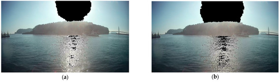 Figure 7 illustrates a comparison between two methods: (a) setting the threshold value based on the average pixel values of the top 0.1%, where the pixels identified as atmospheric light are set to 0, and (b) setting the threshold value based on the average pixel values within the designated patch size around the top 0.1% of pixels, also setting the atmospheric light pixels to 0. Comparing these two methods, (a) and (b), demonstrates that using a patch size setting more effectively reduces the influence of atmospheric light, setting the pixel values to 0. This approach helps accurately identify and mitigate the effects of atmospheric scattering on image quality. The formula used for setting the pixel values to 0 when estimating atmospheric light is defined as follows in Equation (4):
