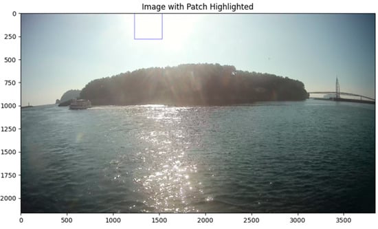 Additionally, Figure 8 shows an example image where the patch size is set to 301 × 301 pixels. In this figure, the x-axis and y-axis represent the dimensions of the image, and the blue-highlighted areas indicate the patch size surrounding the top 0.1% brightest pixels in the DC image. These patches, located around the top 0.1% brightest pixels, are shown to be influenced by atmospheric light. To accurately identify pixels affected by atmospheric light, the average values of the R, G, and B channels within the designated patches around the top 0.1% brightest pixels are calculated [35]. The threshold for determining atmospheric light is set at 0.95. This approach precisely identifies and excludes pixels affected by atmospheric light from further analysis, thereby improving the accuracy of fog density estimation. By setting the threshold in this manner, errors caused by reflected sunlight or other external light sources are effectively reduced, enhancing the reliability of detecting atmospheric light effects. As a result, this method provides more accurate and reliable data for subsequent processing and analysis, ensuring that the true conditions of the scene are more faithfully represented.
