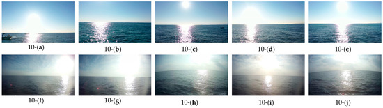 Figure 9 displays images from the Baengnyeongdo region in Dataset (a), categorized by fog intensity. In Figure 9, represents No-fog, represents Low-fog, represents Mid-fog, and represents Dense-fog. Figure 10 presents examples from Dataset (b), showcasing images from clear days with abundant ambient light, as seen in Figure 10a–j.