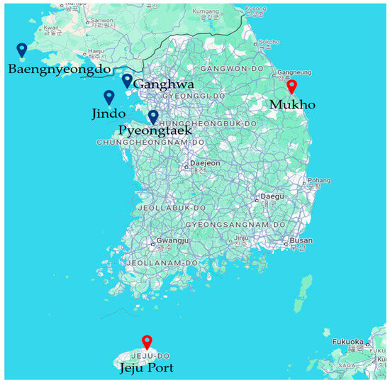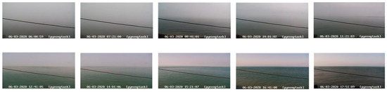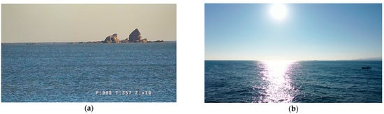Figure 9 Dataset (a) consists of images with minimal atmospheric light interference, captured from four different ports equipped with buoys. These ports were carefully selected to reduce the impact of atmospheric light, ensuring that high-quality data could be used for analysis. In contrast, Figure 10 Dataset (b) comprises images taken from several ports significantly affected by atmospheric light, intended for comparative analysis with Figure 9 Dataset (a). All datasets were captured in South Korea. The images in Dataset (a) shown in Figure 9 were taken from the ports of Ganghwa, Pyeongtaek, Baengnyeongdo, and Jindo, marked with blue dots on the map. On the other hand, Figure 10 Dataset (b) includes images captured from Jeju Port and Mukho Port, marked with red dots on the map. The geographic locations of these ports are visually represented in Figure 11, helping to understand the distribution of the datasets.