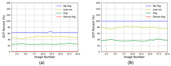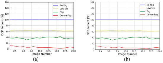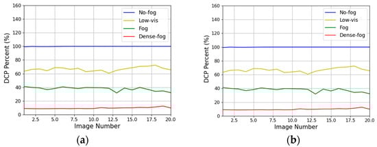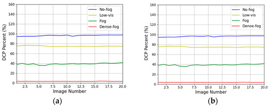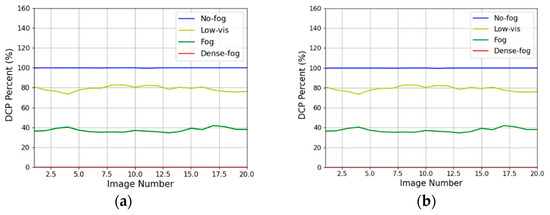 The interpretation of the results is presented through Figure 14, Figure 15, Figure 16 and Figure 17. In these figures, Graph (a) represents the results for images with the sky region removed, while Graph (b) shows the results after applying the AEA-RDCP algorithm. The comparison of the two graphs reveals that the DC percentage values align with the criteria outlined in Table 1 and are nearly identical for both algorithms. This similarity is attributed to the minimal influence of external light sources, such as sunlight reflections, in Dataset (a) from the four regions. Therefore, it is confirmed that the AEA-RDCP algorithm is just as effective as the RDCP algorithm in measuring fog density in images without atmospheric light influence.