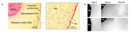 An overview of the isolation of WJ-MSCs and SA-MSCs. (A) Histology of human umbilical cord. (B) Morphology of cells derived from tissue explant technique. Primary explant cultures from human WJ and SA explants at early stage outgrowth at 2 and 8 days after explantation. Cell reached over 80% confluence after 16 days in culture. Scale bar = 200 μm.