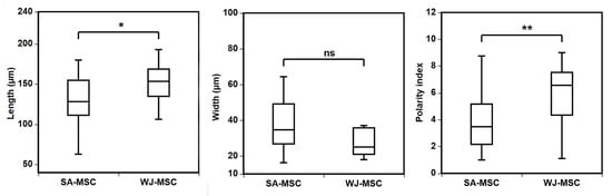 The morphological characteristics of SA-MSCs (n = 220) and WJ-MSCs (n = 205) were analyzed 24 h after passaging (P3). Values were obtained from three pairs isolated from the same UC. SA-MSCs have a longer length, a higher polarity index, and a similar width to WJ-MSCs. Indicated statistical significance represents p < 0.05 *, p < 0.01 **, and a non-significant value is expressed as ‘ns’ in the graph.