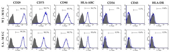 Verification of MSC identity of adherent cells derived from WJ and SA by analyzing the expression of MSC markers. The numbers display the frequency of positive staining for cell surface markers (blue lines) in comparison to the isotype controls (gray histograms). The cells demonstrated positive expression of CD90, CD73, CD29, and HLA-ABC, and negative expression of CD34, CD45, and HLA-DR.