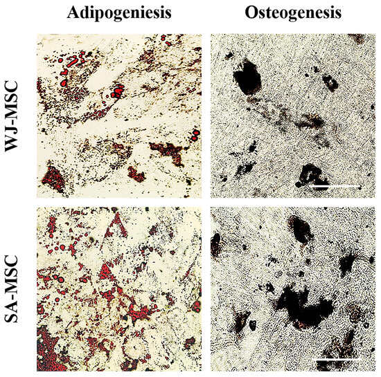 Adipogenic and osteogenic differentiation potential of WJ-MSCs and SA-MSCs. Scale bar = 100 μm.