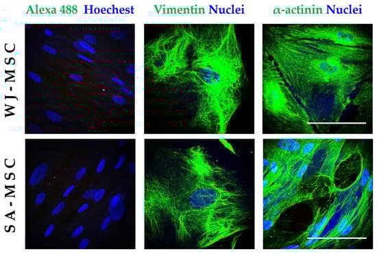 Confocal microscopy images of WJ-MSCs and SA-MSCs stained with Vimentin and α- actinin. Scale bar = 100 μm.