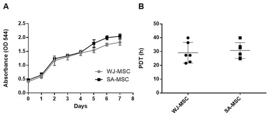 The growth characteristics of MSCs are essential for providing the required quantity of cells for clinical use. Consequently, a comparison of the growth of WJ-MSCs and SA-MSCs was performed. The results showed no significant difference in the proliferation profiles (Figure 6A). Based on the calculation, the PDT of the WJ-MSCs was 29.19 ± 7.7 h, and that of the SA-MSCs was 31.96 ± 6.4 h (Figure 6B).