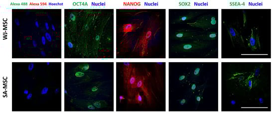 Expression of pluripotency markers in WJ-MSCs and SA-MSCs. Confocal microscopic analysis of OCT4A, SOX2, NANOG, and SSEA-4. Scale bar = 100 μm.