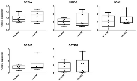 The OCT4A (octamer-biding transcription factor 4A), NANOG, and SOX2 (Sex determining region Y-box 2) were found to be present in the nuclei of both cell types. Additionally, a cytoplasmic expression of NANOG was observed. The surface protein SSEA4 (stage-specific embryonic antigen-4) was detected in MSCs from the SA and WJ (Figure 7). Comparing the levels for mRNA of OCT4A, OCT4B, OCT4B1, NANOG, and SOX2 in both WJ-MSCs and SA-MSCs, no statistically significant differences were found (Figure 8).