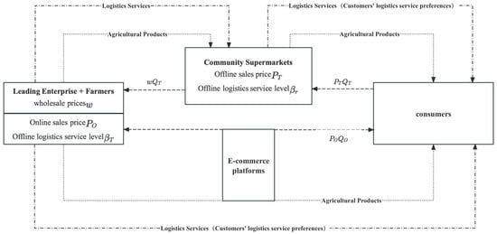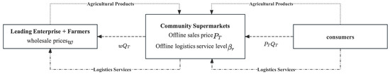 In the dual-channel agricultural supply chain model (CD), different from the CS, the leading agricultural products enterprise, as a producer, can sell agricultural products to community supermarkets or large-scale superstores through offline channels and can also sell agricultural products directly to consumers on the e-commerce platform through online channels.