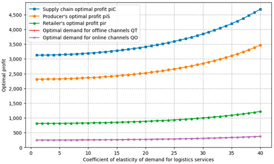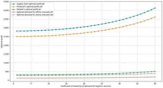 To analyse the impact of changes in the logistics demand elasticity coefficient on optimal profit, optimal demand, and optimal decision-making in agricultural supply chains, the value of is taken between 1 and 40. Only the value of was changed, leaving the values of the other parameters at the base setting, and the graphs describing the relationship between optimal profit, optimal demand, optimal decision variables and the sensitivity coefficients of logistics services are plotted in supply chains under centralised decision-making.