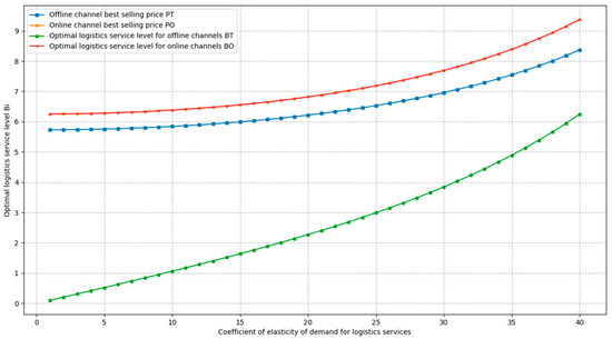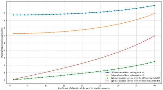 From Figure 3 and Figure 4, it can be seen that the profit of the supply chain, the profit of the producer, the profit of the retailer, the market demand of the offline channel, and the demand of the online channel, all increase with the increase in the coefficient of elasticity of demand for logistics services. As the elasticity coefficient of demand for logistics services increases, the optimal profit, optimal demand, and optimal decision variables grow faster, indicating that as consumers pay more attention to the level of logistics services, the overall profit of the supply chain under centralised decision-making will increase at a higher level of logistics services.