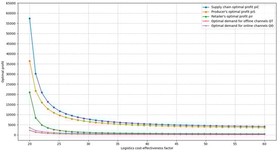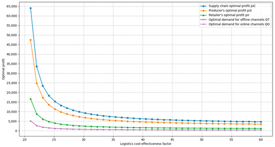 We analysed the impact of changes in the logistics cost-effectiveness coefficient on the optimal profit, optimal demand, and optimal decision-making in the supply chain for values taken between 20 and 60. Only the value of was varied, and the values of other parameters were consistent with the base setting. The graphs describing the relationship between optimal profit, optimal demand, optimal decision variables and logistics cost-effectiveness coefficients were plotted for supply chains under centralised decision-making.