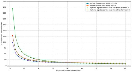 We analysed the impact of changes in the logistics cost-effectiveness coefficient on the optimal profit, optimal demand, and optimal decision-making in the supply chain, and to ensure that the range of values of met the basic Assumption 5, taking the value of between 20 and 60. Only the value of was changed, and the values of other parameters were consistent with the base setting. The graphs describing the relationship between the optimal profit, optimal demand, optimal decision variables, and the logistics cost-effectiveness coefficient in supply chains with different channel types under decentralised decision-making were plotted.