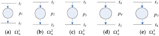 Figure 1a–e show the DTPN models , , , and for the first operation, the second operation, the third operation, the fourth operation and the fifth operation, respectively.