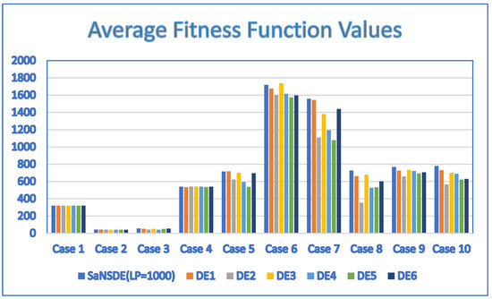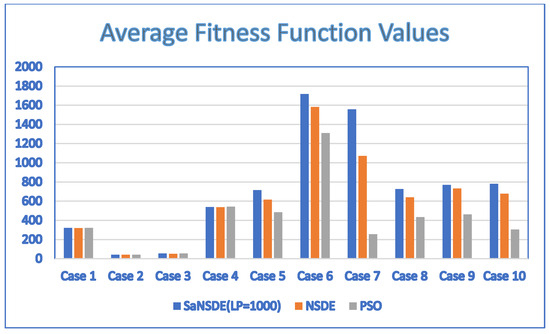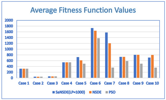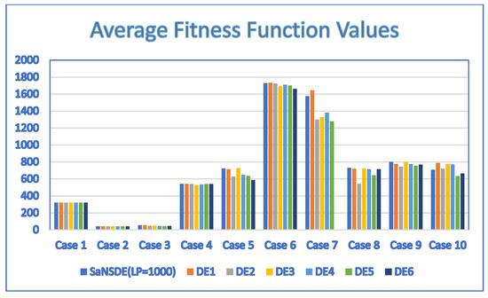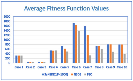 To study the effects of population size on the performance of the proposed algorithm, we performed three series of experiments for all test cases for = 10, 30 and 50. The results show that the average fitness values of Case 1, Case 2 and Case 3 are the same. For Case 4 through Case 10, the differences between the average fitness values for = 10, 30 and 50 are small in terms of percentage. This indicates that the proposed SaNSDE algorithm is not sensitive to population size. In summary, the above results show that the proposed algorithm can ensure that the variation in solutions is smaller than in the other algorithms compared in this study with only a few exceptions regardless of the population size.