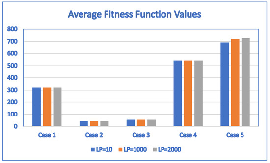 For Case 10, the maximum average fitness value is 797, which is obtained by setting = 30 or = 50, and the minimum average fitness value is 780.1, which is obtained by setting = 10. The difference between the maximum and the minimum average fitness values is (797 − 780.1)/780.1 = 2.1663%.