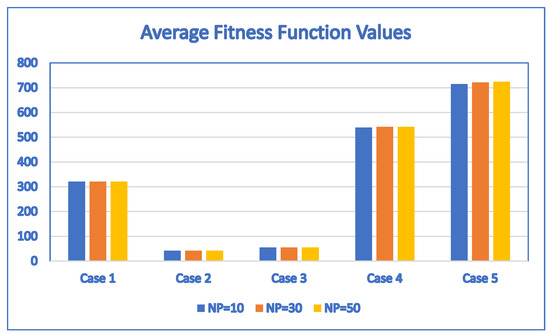 For other test cases, although the average fitness values are not always the same, they are close. For Case 4, the maximum average fitness value is 542.2, which is obtained by setting = 30 or = 50, and the minimum average fitness value is 539, which is obtained by setting = 10. The difference between the maximum and the minimum average fitness values is (542.2 − 539)/539 = 0.5936%.