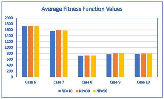 For Case 8, the maximum average fitness value is 731, which is obtained by setting = 30 or = 50, and the minimum average fitness value is 726.9, which is obtained by setting = 10. The difference between the maximum and the minimum average fitness values is (731 − 726.9)/726.9 = 0.5640%.