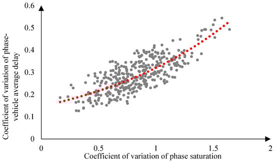 To further analyze, this study takes a four-phase single-point intersection as a sample and randomly generates 362 sets of effective basic data for different intersections. Using the Webster model, the cycle length, green time ratio, and phase-average delay of each intersection in each group are calculated. Considering that the coefficient of variation can eliminate the influence of measurement scales and dimensions, it is chosen as a parameter to measure the degree of difference in data, such as phase-average delay.