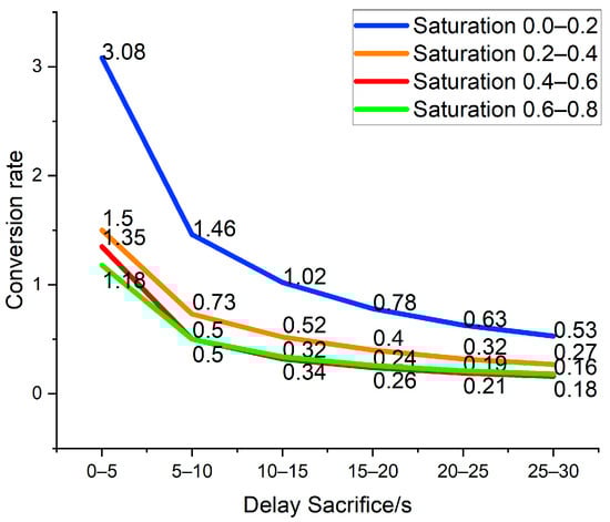 In conclusion, sacrificing delay for fairness is feasible and has minimal impact on delay, making it more suitable for low-saturation intersections. The purpose is to demonstrate the fair conversion rate achieved through sacrificing delay. Initially, when the total delay time sacrificed is relatively short, the conversion rate is high, indicating a significant fairness effect. However, as the total delay time sacrificed increases, the fairness effect obtained becomes less apparent, as shown in Figure 5.