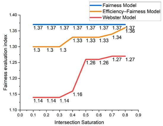 Regarding saturation, under low saturation conditions, the efficiency–fairness model showed better performance. The mean improvement in the fairness evaluation index for saturation levels between 0.1 and 0.4 was 0.16, while for saturation levels between 0.5 and 0.8, it was only 0.075. In terms of trend, higher saturation levels correlated with higher fairness evaluation index values. At saturation levels of 0.1 and 0.8, the mean fairness evaluation index values were 1.27 and 1.33, respectively. Furthermore, the higher the saturation level, the smaller the differences between the models. At saturation levels of 0.1 and 0.8, the mean differences between the models were 0.115 and 0.03, respectively, especially notable between the efficiency–fairness model and the efficiency model, with differences of 0.16 and 0.09 at saturation levels of 0.1 and 0.8, respectively. The following figure illustrates the fairness evaluation index curves for each model.