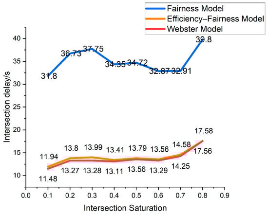 Regarding saturation, the saturation level had little impact on the efficiency–fairness model. As for the trend, higher saturation levels correlated with greater vehicle delays. At saturation levels of 0.1 and 0.8, the mean vehicle delays were 18.4 and 24.98, respectively. Additionally, as saturation levels increased, the differences between the models did not change significantly, with a mean difference of 10.7. At saturation levels of 0.1 and 0.8, the differences were 10.16 and 11.12, respectively. The following figure illustrates the delay curves for each model.