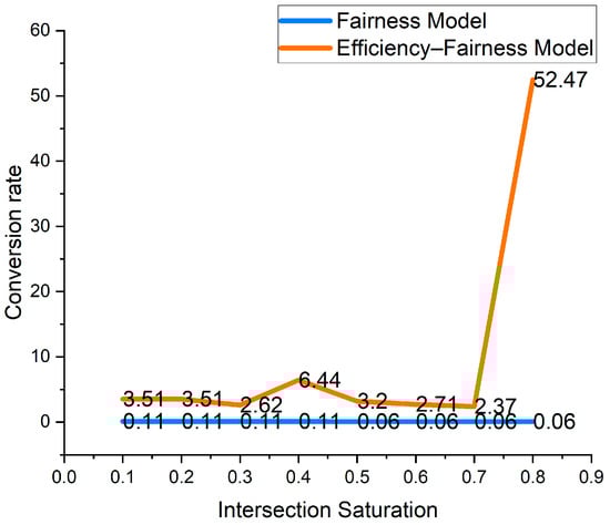 Regarding saturation, under low saturation conditions, the efficiency–fairness model exhibited better performance. Excluding the outlier at saturation level 0.8, the mean conversion rates for saturation levels 0.1 to 0.4 were 4.0, greater than the rates for saturation levels 0.5 to 0.7, which were 2.76. With changes in saturation levels, the two models showed different trends. While the fairness model exhibited a decreasing conversion rate with increasing saturation levels, the efficiency–fairness model showed fluctuations in its conversion rate with changes in saturation levels without a clear trend. The figure below illustrates the conversion rate curves for both models.