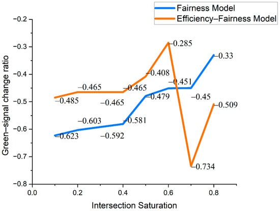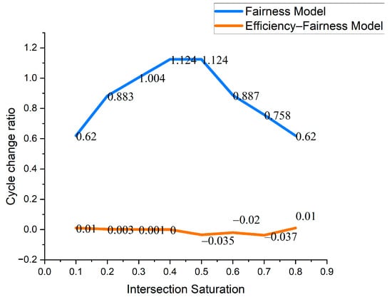 Regarding saturation levels, under low saturation conditions, the efficiency–fairness model exhibited better performance. The mean change ratio for saturation levels 0.1 to 0.4 was 0.0035, whereas for saturation levels 0.5 to 0.8, it was as high as 0.026. In terms of trends, with changes in saturation levels, the two models showed different trends. While the fairness model initially exhibited an increasing and then decreasing trend in change ratio and increasing saturation levels with significant fluctuations, the efficiency–fairness model showed fluctuations without a clear trend with changes in saturation levels. The figure below illustrates the change ratio curves for cycle lengths for both models.