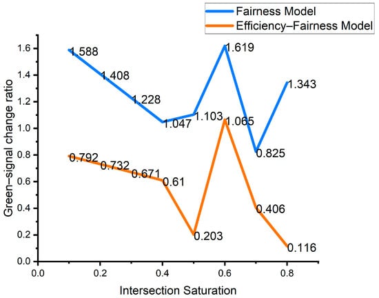 Regarding saturation levels, although the efficiency–fairness model exhibited slightly higher change ratios under low saturation conditions, its fluctuation was significantly smaller than under high saturation conditions. For saturation levels of 0.1 to 0.4, the mean change ratios for both low and high green time ratios were 0.47 and 0.7, respectively, with standard deviations of 0.01 and 0.08. For saturation levels of 0.5 to 0.8, the mean change ratios were 0.484 and 0.446, respectively, with standard deviations of 0.19 and 0.43. In terms of trends, the change rate for phases with low saturation levels increased with saturation levels, while for phases with high saturation levels, the change rate decreased with saturation levels. The figures below illustrate the change ratio curves for green time ratios for both models, which are shown in Figure 10 and Figure 11.