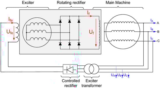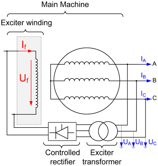 In an SM with static excitation, as shown in Figure 1, the excitation current (If) is controlled directly by a controlled rectifier which modifies the field winding voltage (Uf). As the temperature increases, the excitation field winding resistance increases, and consequently, the excitation voltage must be raised to maintain a constant excitation current.