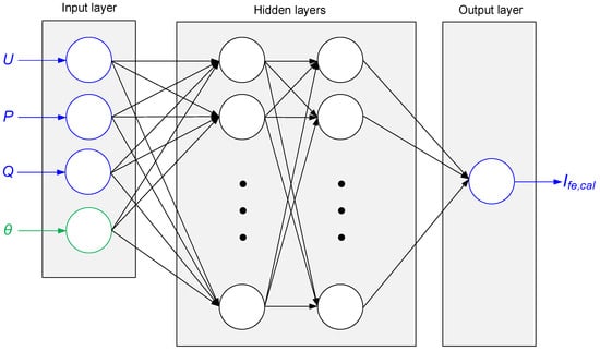 The feed-forward DNN is trained using the popular backpropagation method [25,26,27], in order to align the outputs (Ife,cal) as closely as possible with the measured values (Ife,mea). Backpropagation is an iterative gradient descent optimization technique applied to the network’s weight space, enabling the weights to be updated in each iteration and to progressively minimize the cost function (CF).
