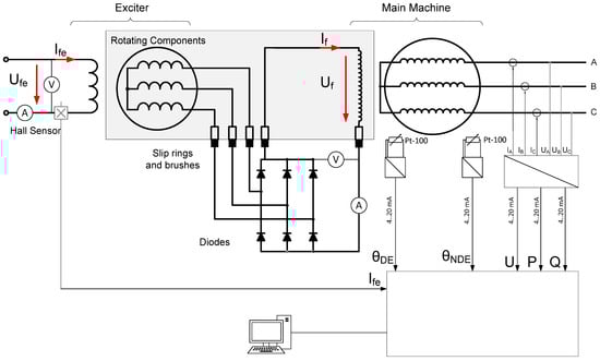 This BSM was modified by adding 5 slip rings and brushes to permit access to the field winding of the main machine and to the “rotating” diodes (which were actually made static in this setup and placed outside of the machine). This modification allows for the measurement of the voltage (Uf) and the current (If) of the field winding of the main machine and consequently the temperature by observing variations in its resistance. Additionally, two Pt−100 type temperature sensors were installed at both ends of the armature windings of the main synchronous machine, and these temperatures were also recorded.