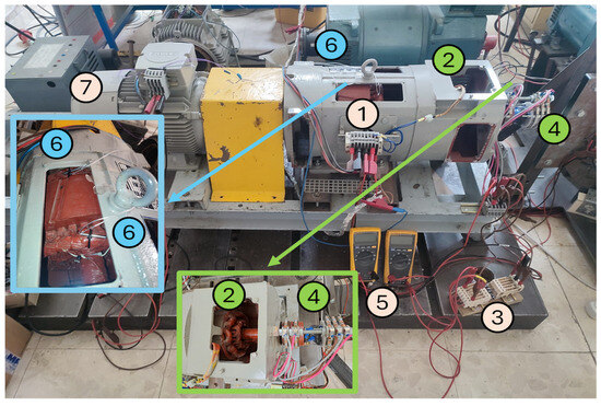 Experimental setup: (1) main machine, (2) exciter, (3) diodes, (4) slip rings and brushes, (5) main field winding voltage and current measurement, (6) stator temperature measurement, and (7) driver (induction motor).