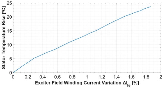 Exciter field current rise (∆Ife) with respect to stator temperature rise during a 2 h operation test (P = 2.9 kW, Q = 2.3 kvar, U = 400 V).