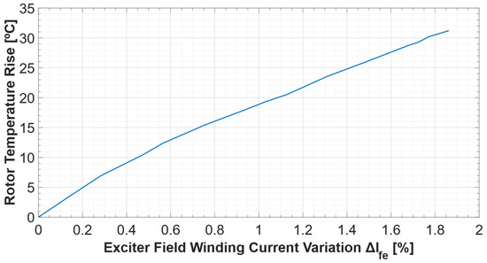 Exciter field current rise (∆Ife) with respect to rotor temperature rise during a 2 h operation test (P = 2.9 kW, Q = 2.3 kvar, U = 400 V).