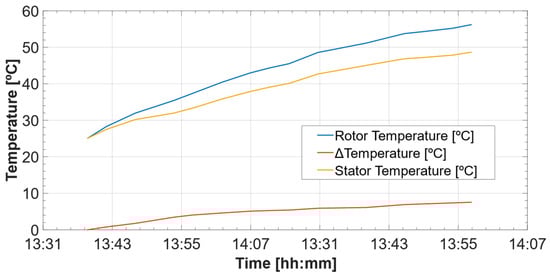 Additionally, Figure 12 displays the rotor and stator temperatures during a constant reactive power test. The difference between them is also represented. This difference is not constant and varies depending on the machine temperature.