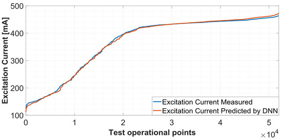 As shown in Figure 13, the DNN excitation current prediction is highly accurate, with a maximum error of 3 mA, which is an error of 1.5%. The MSE obtained is 0.5%, which means that the minimum detectable fault severity is 0.5%, considering the fault severity of Equation (2).