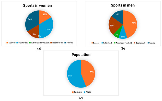 In this research, we surveyed a cohort comprising 825 athletes (364 females and 461 males) engaged in various sports activities including soccer, volleyball, American football, basketball, and tennis (Figure 1). The cohort was not divided into male and female groups so as to observe the overall behavior of the athletes irrespective of gender, with the aim of avoiding potential bias in the results and ensuring that the findings would apply to all athletes.