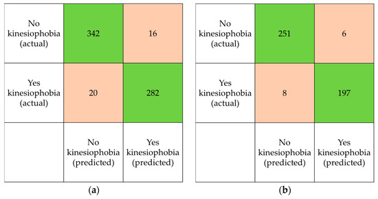 Starting with the overall confusion matrix (Figure 3a), we can observe that in 342 cases, the model correctly predicted the absence of kinesiophobia (TP), while in 282 cases, it correctly predicted the presence of kinesiophobia (TN). However, there are also 20 cases where the model incorrectly predicted the absence of kinesiophobia when it was present (FN), and 16 cases where it incorrectly predicted the presence of kinesiophobia when it was not present (FP).