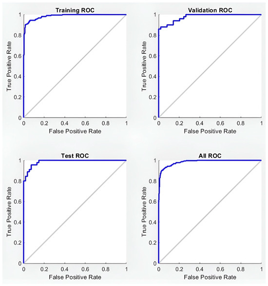 The receiver operating characteristic (ROC) curve is a graphical representation of the relationship between the true positive rate (TPR), or recall, and the false positive rate (FPR) at various classification thresholds. The area under the curve (AUC) is a metric used to determine a model’s ability to distinguish between classes. In this case, as shown in Figure 4, the AUC values are 0.975 for training, 0.957 for validation, and 0.958 for the test.