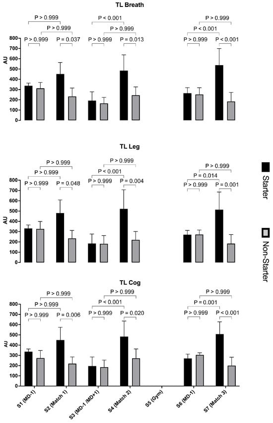 The results for tournament total exposure minutes and internal and external cumulative load can be found in Figure 6. Significant differences were observed between starters and non-starters in the total exposure minutes during the tournament (p = 0.018; mean difference [95%CI] = −64.6 min [−117.3 to −11.86]). The internal load experienced by starters throughout the tournament was higher than that of non-starters for TLBreath (p = 0.002; mean difference [95%CI] = −592.1 AU [−950 to −233.5]), TLLeg (p = 0.002; mean difference [95%CI] = −598.0 AU [−950.0 to −237.7]), and TLCog (p = 0.002; mean difference [95%CI] = −539.4 AU [−871.9 to −207.0]). Both the TD (p = 0.003; mean difference [95%CI] = −8211 AU [−13,358 to −3064]) and PL (p = 0.008; mean difference [95%CI] = −102.6 [−176.4 to −28.80]) were higher for starters compared to non-starters. However, the accumulated HSR was similar between roles (p = 0.139; mean difference [95%CI] = −164.8 [−386.1 to 56.41]).
