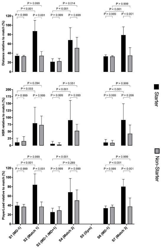 On the other hand, non-starter players did not show an undulatory load pattern. All sessions for non-starters (whether training or matches) presented similar differential sRPE values throughout the tournament (p > 0.999). According to these patterns, starting players experienced a higher internal load than non-starters during matches (Sessions 2, 4, and 7; p < 0.037), with no differences between training sessions (Sessions 1, 3, and 6; p > 0.999). Non-starter players had the highest TD and HSR in the first match (Session 2), while PL was similar in all tournament sessions (p > 0.999). The first match was the most intense (expressed in relative values per minute) for non-starter players (Figure 4). The intergroup analysis revealed that starting players only had a higher training volume during matches (Sessions 2, 4, and 7).