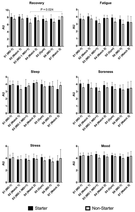 According to the evolution observed over the course of the tournament days, no modifications were detected in any of the dimensions of wellness and the overall wellness score for either starters or non-starters. Only the non-starters showed a lower perceived recovery in S3 compared to S7 (p = 0.024) (Figure 5).