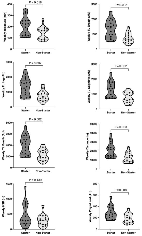 Statistical analyses and graphs were conducted using SPSS (version 22, Inc., Chicago, IL, USA) and Graphpad Prism v9.0 (Boston, MA, USA). The normality assumption was tested for each variable with the Shapiro–Wilk test. Data were analyzed through factorial linear mixed modeling with a 95% confidence interval (CI) to assess the impact of training/competition seasons along the tournament. This approach is suitable for repeated measures data from unbalanced designs, which was the case in our study, as there is some missing data. In this study, the role of the players, based on whether they started the match as starters or non-starters, was used as a fixed effect. Pairwise comparisons were examined using Bonferroni’s post hoc test. For the weekly training load, an independent sample t-test or Mann–Whitney U test was carried out to establish the possible differences between starters and non-starters. The results are presented as mean ± standard deviation (SD), with the significance set at p < 0.05.
