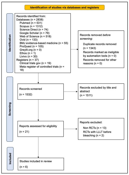 Six studies met the inclusion criteria and were included in the systematic review. All studies were written in English and were published in the last 9 years. They were all RCTs, with a total of 308 patients treated with either LLLT as a monotherapy (n = 160) or non-LLLT (n = 148) after in-office tooth bleaching. All patients had good oral health and were free from medical conditions. Cracked teeth or teeth with caries were eliminated from the test samples.