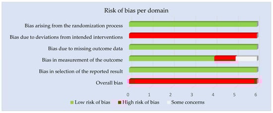 The quality assessment of the included RCTs was conducted by two of the authors (K.P., D.S.) using the revised Cochrane risk of bias assessment tool for randomized controlled trials (RoB 2). This tool permits the evaluation of five distinct domains: the randomization process (random sequence generation and allocation concealment), deviations from intended interventions (blinding of participants and personnel and adherence to the intervention), missing outcome data, the measurement of the outcome (blinding of outcome assessment), and the selection of reported results (selective reporting of outcomes). Each domain was assessed as representing a low risk of bias, some concerns, or a high risk of bias.