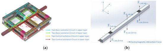Figure 1b also indicates the electromagnetic suction force acting on the MC. The resultant force of the upper and lower electromagnetic suction forces on the MC is the left levitating force: