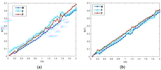 When passing a current i1 = 0~2 A through the upper left levitating coil, a set of upper left air gap flux density values was measured, and the relationship between the i1 and the magnetic flux in the upper left air gap was plotted, as shown in Figure 3a.